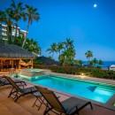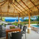 The single-level home's outdoor space is framed by towering palm trees, providing a lush, private oasis with stunning waterfront views. Well-placed landscaping ensures privacy without obstructing the views. The expansive pool deck, featuring a heated swimming pool and Jacuzzi, is lined with multiple deck loungers.Two thatched palapas, each sheltering an outdoor dining table and chairs, enhance the space. One palapa includes a relaxing hammock, perfect for swaying gently in the ocean breeze while fully shaded from the sun.