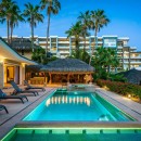 Two more sliding glass doors connect the pool deck to private bedrooms, allowing guests to wake up to the luxury of direct water views. Each bedroom has its ensuite bath and in-room A/C for added comfort. The upscale home also boasts a gourmet kitchen with professional appliances, including an espresso machine. Neutral hues and rich woodwork are complemented by vibrant home décor and artwork throughout the home.