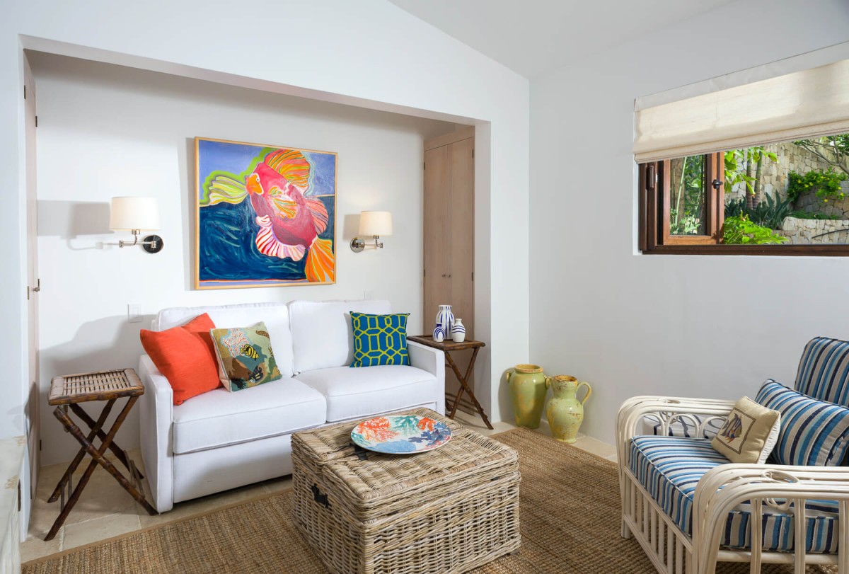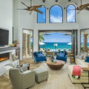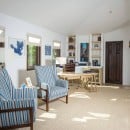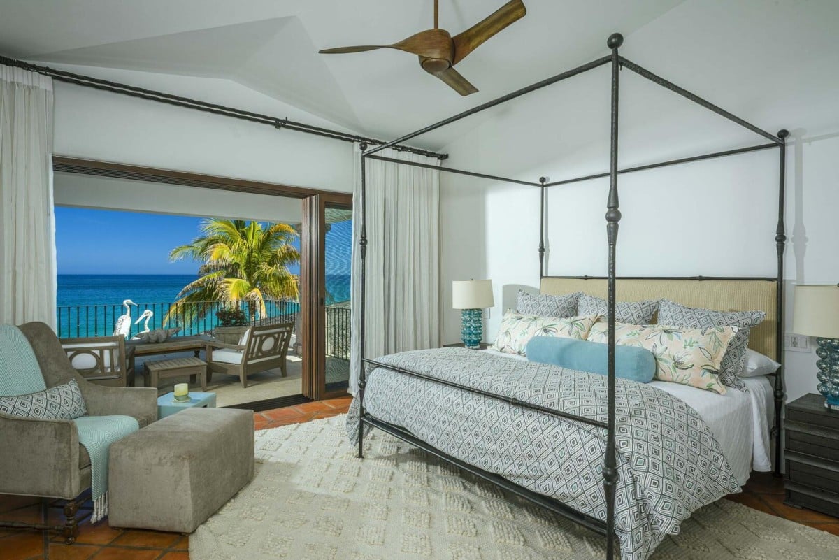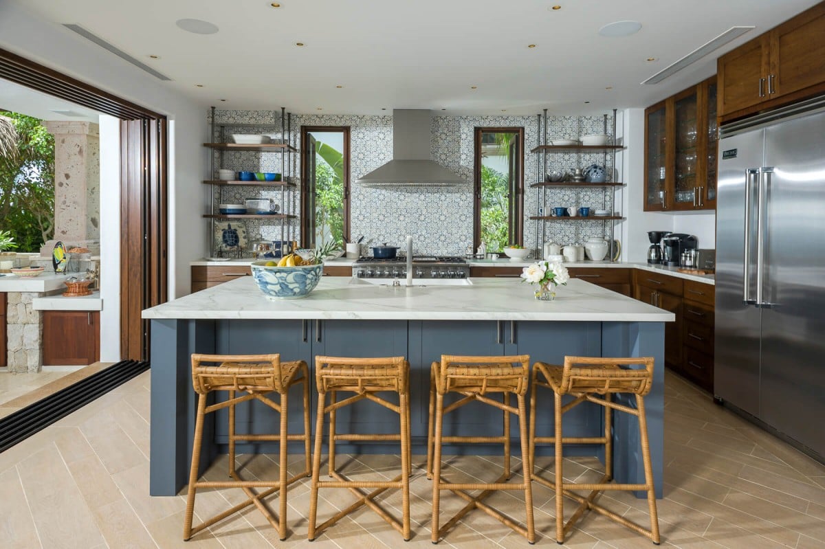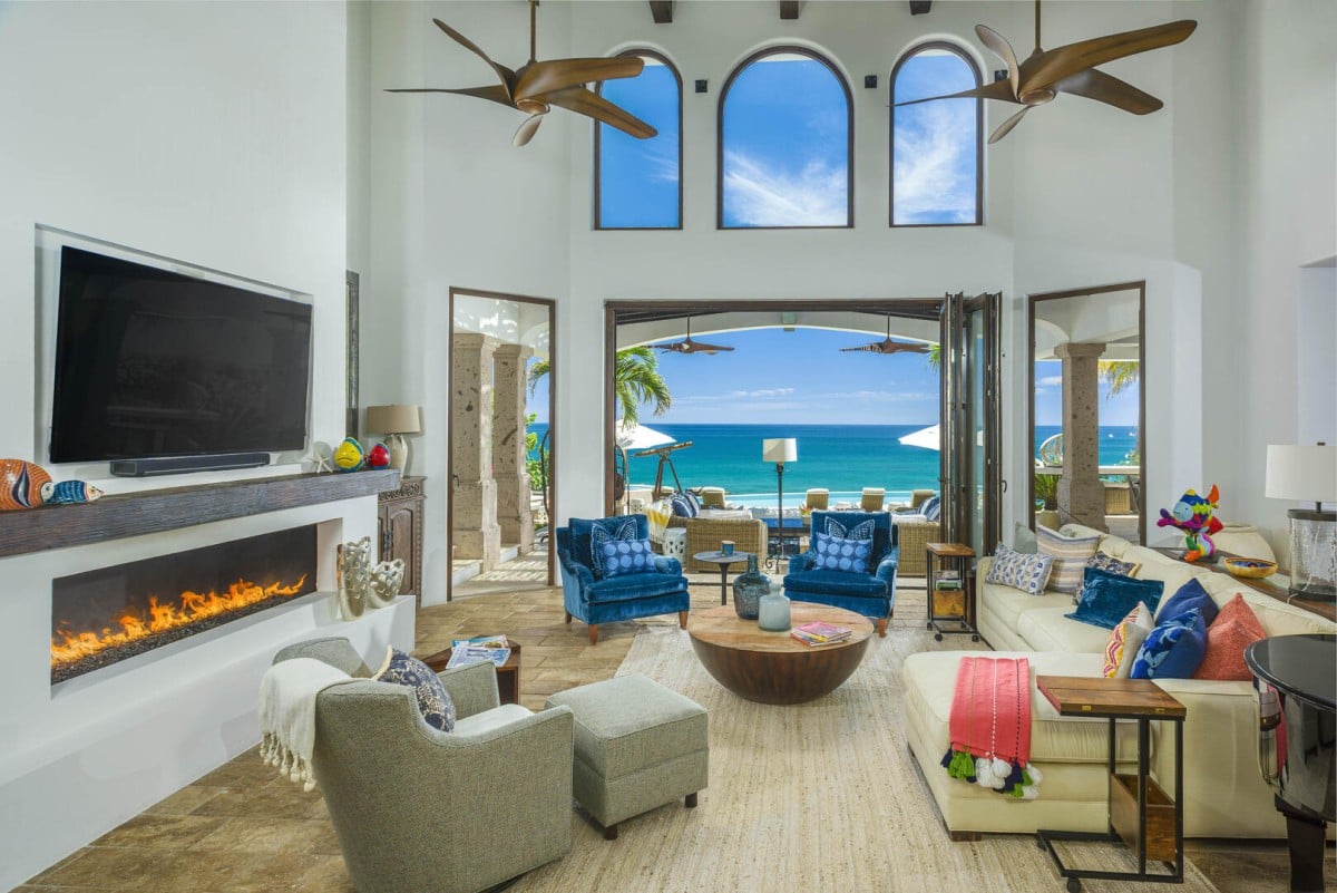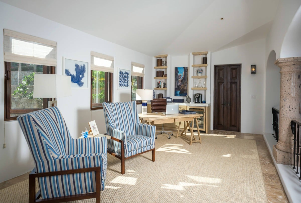 Inside, the villa is equally impressive. Four bedrooms in the main house open directly to outdoor spaces and sweeping ocean views, while a private casita provides additional accommodations. The home features a gourmet kitchen with wine refrigerator and counter seating, an indoor dining area, a double-height living room with expansive windows, an office, and exercise equipment. With its clean white exterior, red tile roof, and a soothing interior palette accented by ocean-inspired blues, Casa Roca de Pajaro offers a refined yet welcoming atmosphere for an unforgettable Los Cabos getaway.