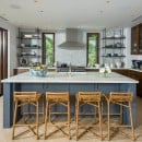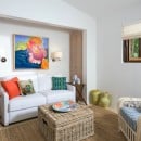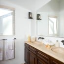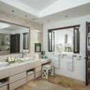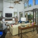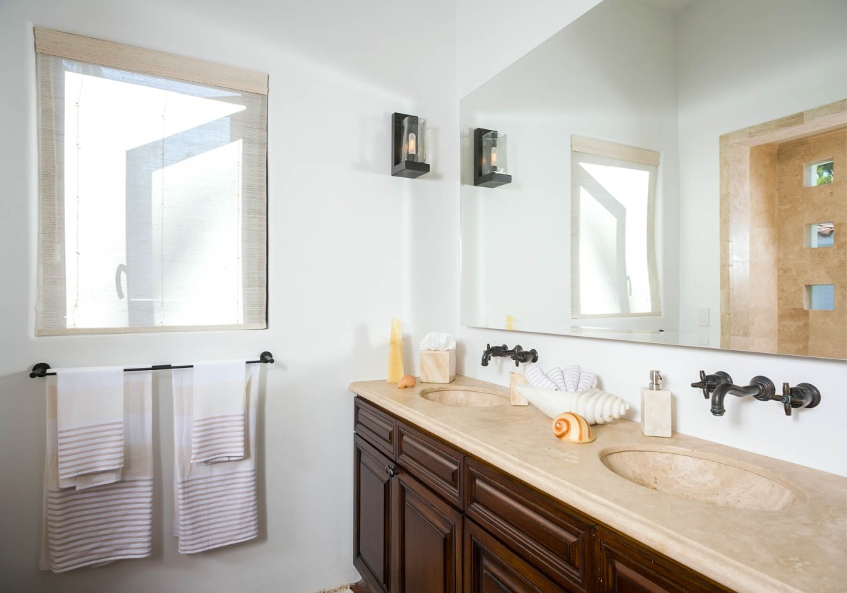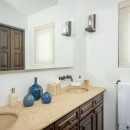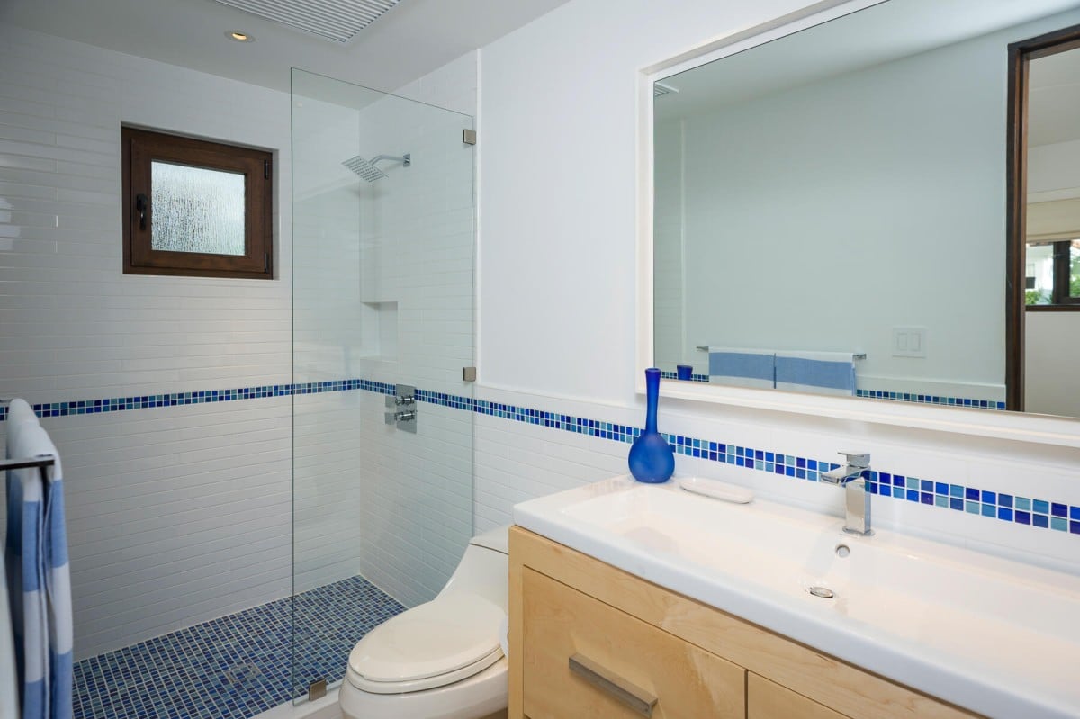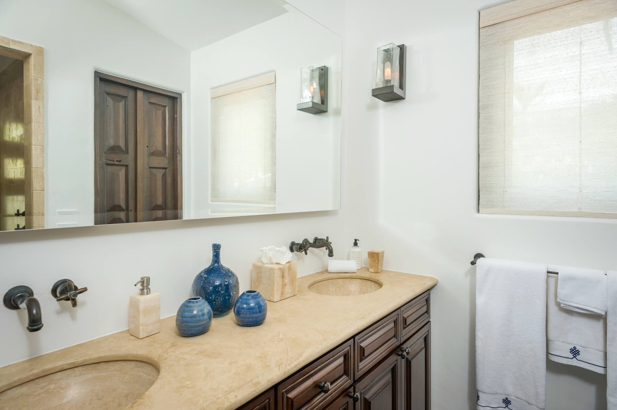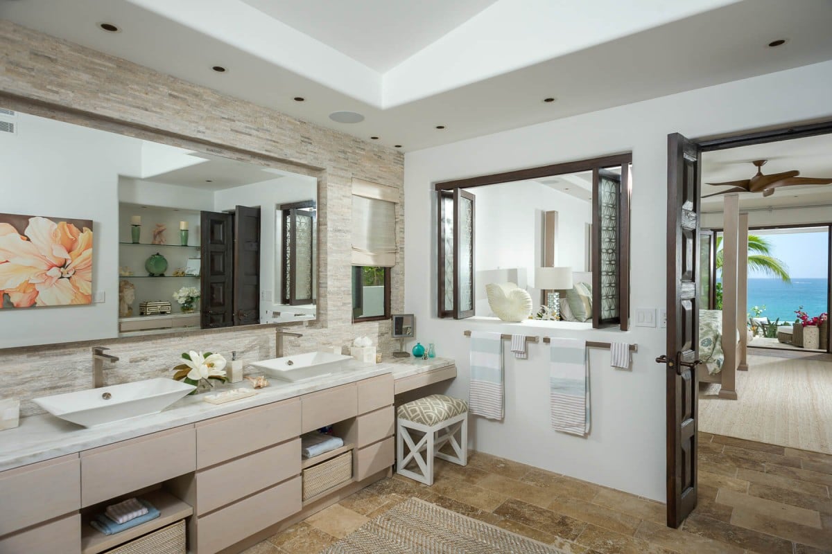 Inside, the villa is equally impressive. Four bedrooms in the main house open directly to outdoor spaces and sweeping ocean views, while a private casita provides additional accommodations. The home features a gourmet kitchen with wine refrigerator and counter seating, an indoor dining area, a double-height living room with expansive windows, an office, and exercise equipment. With its clean white exterior, red tile roof, and a soothing interior palette accented by ocean-inspired blues, Casa Roca de Pajaro offers a refined yet welcoming atmosphere for an unforgettable Los Cabos getaway.