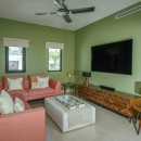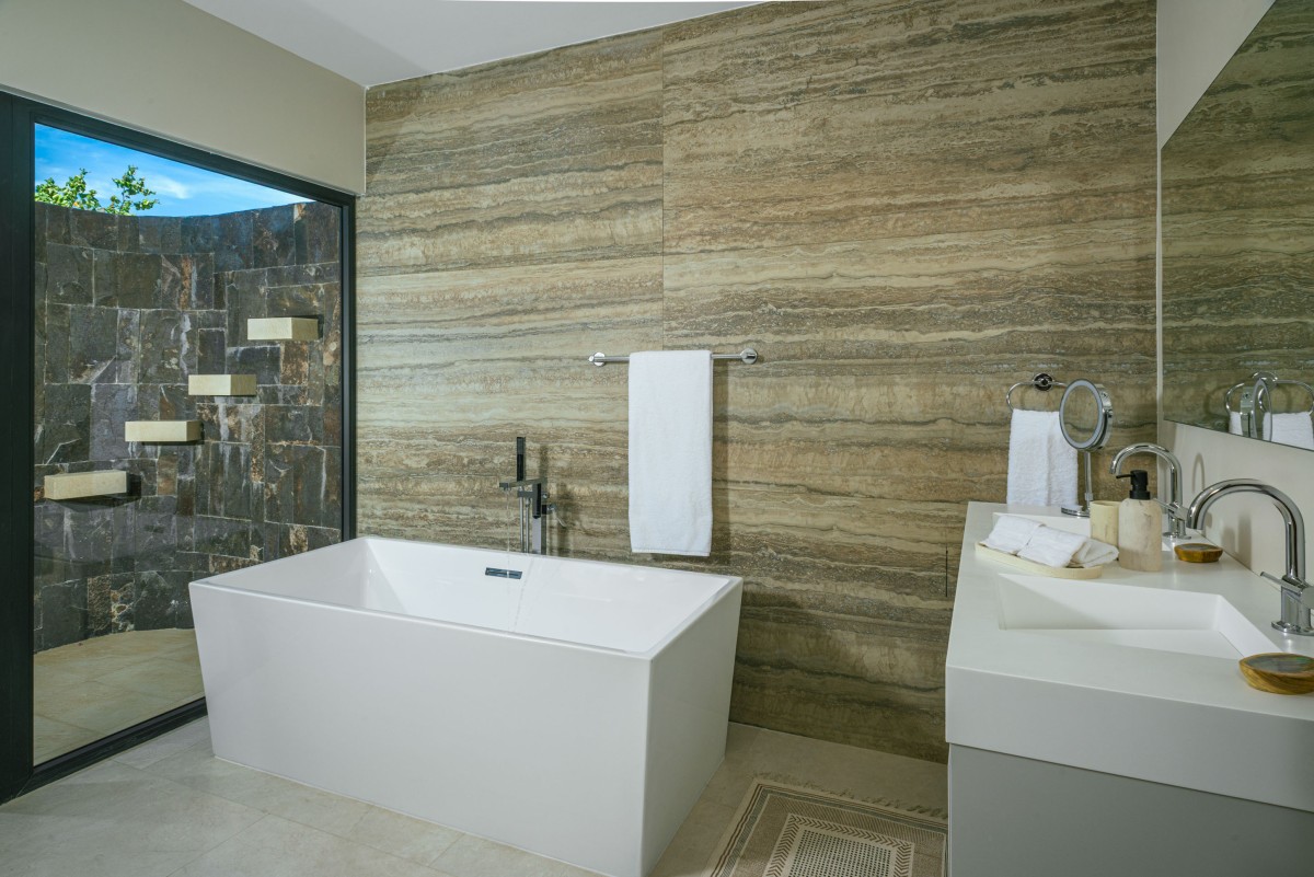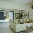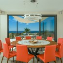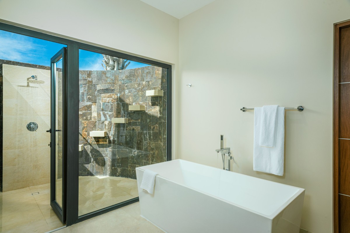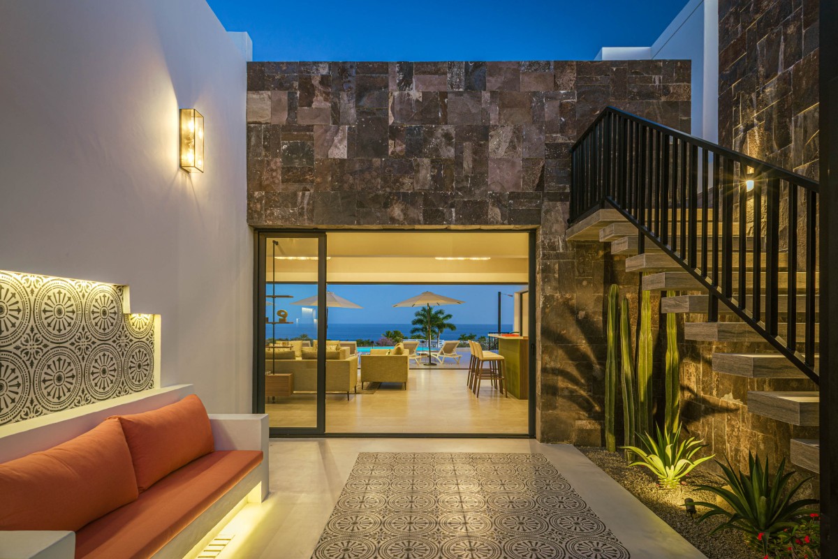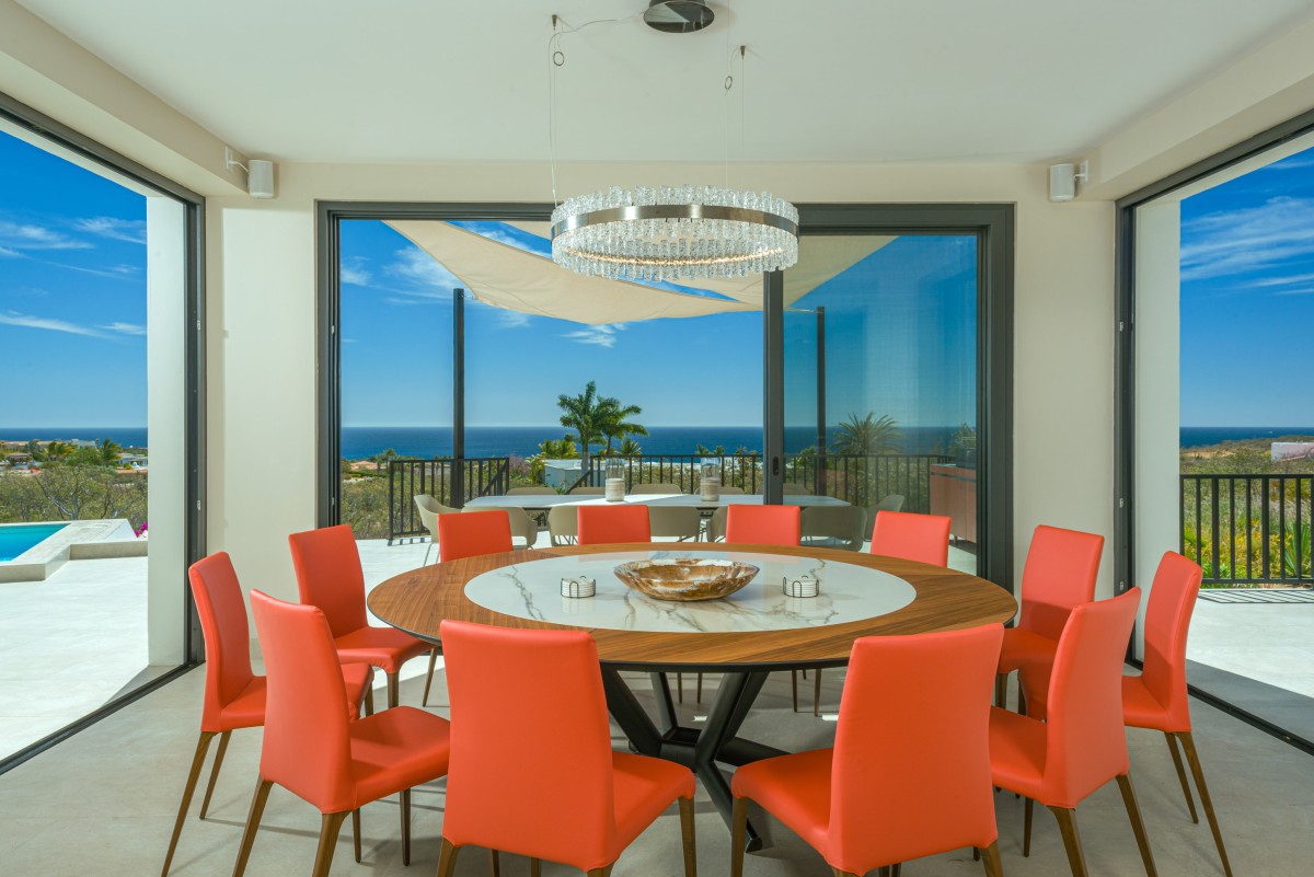 The open-concept living and dining area showcases sweeping views of the Sea of Cortez and is designed to encourage seamless indoor-outdoor living. While the home is equipped with zoned air conditioning, guests can open the floor-to-ceiling windows to welcome in the refreshing sea breeze. Mornings are perfect for yoga on the terrace as the sun rises over the ocean.
