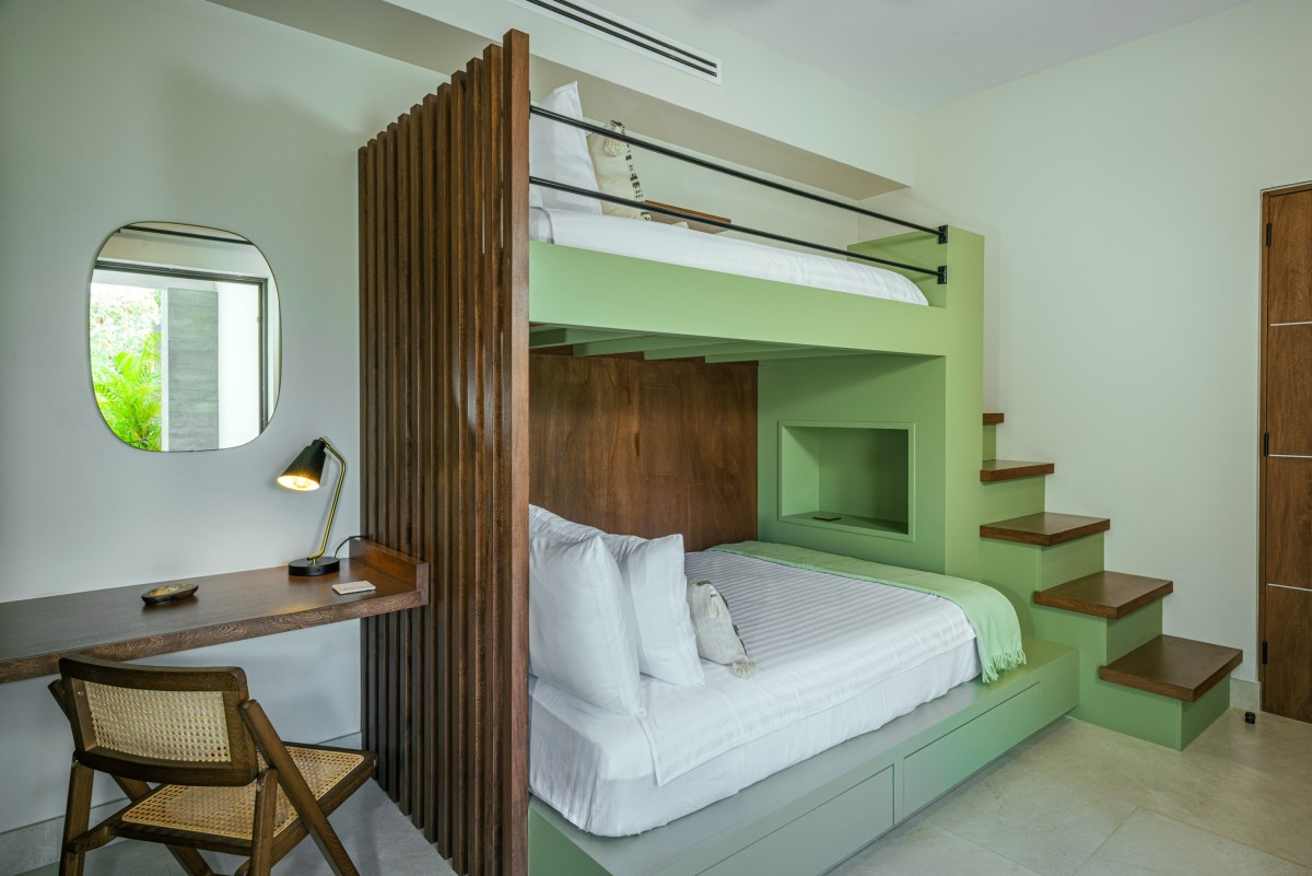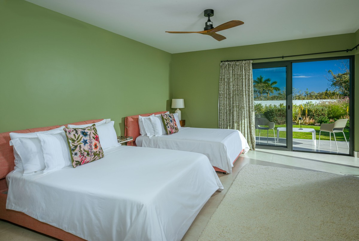 Each bedroom features crisp white linens accented with earthy tones of orange and green. Three bedrooms offer king beds, one bedroom features a modern bunk-bed design with a single and double bed, one has a queen bed, and the garden room includes two queen beds. All bedrooms have newly fitted en-suite bathrooms, with select rooms also offering outdoor showers. For added comfort, every room includes a digital TV, bedside charging stations, Alexa speakers, and an in-room safe.