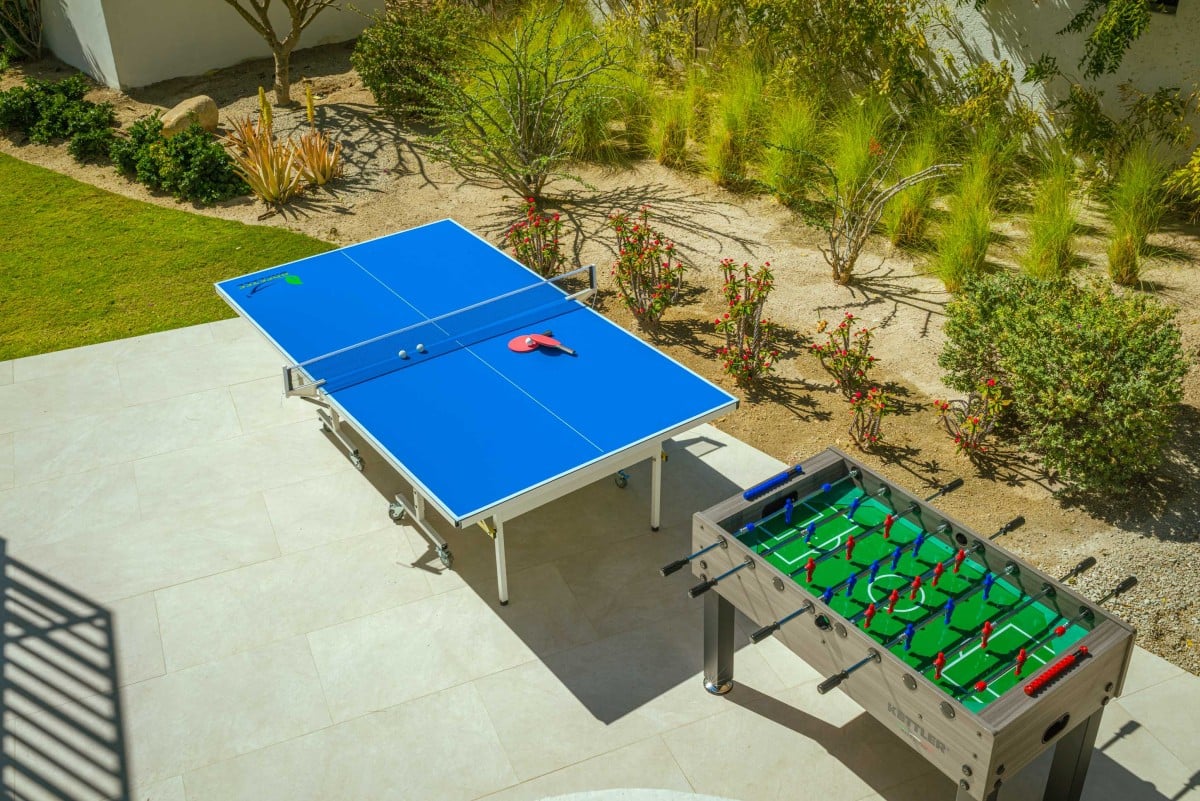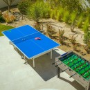 Outdoor living extends onto the expansive terrace, featuring an additional 12-seat dining table beside a fully equipped outdoor kitchen with a Wolf gas grill. Guests can enjoy the heated pool, jacuzzi, shaded lounge chairs, or friendly games of ping pong and foosball. Evenings are perfect for relaxing with a glass of rosé by the firepit or enjoying a movie in the media room. The main entertaining spaces, select bedrooms, and outdoor areas are wheelchair accessible, ensuring comfort and ease for all guests.