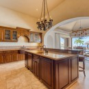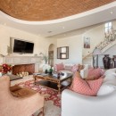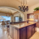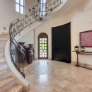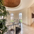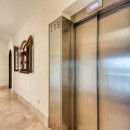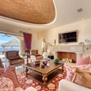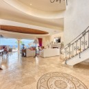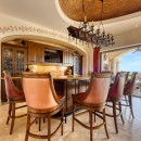 Step through the massive glass doors to the ground floor of the home, where a luxuriously appointed living room with a fireplace and flatscreen TV awaits, along with a bar area for additional seating. The space seamlessly extends to accommodate a ten-seat dining table and a gourmet kitchen with elegant wood cabinetry, along with an island offering more counter seating. You can reach the second level of the home, where most of the six bedrooms and ensuite bathrooms open to partially shaded terrace seating and elevated ocean views, either by using the home's private elevator or ascending the winding staircase.