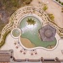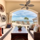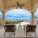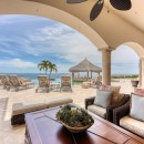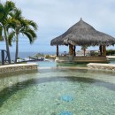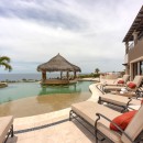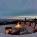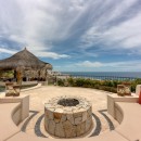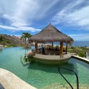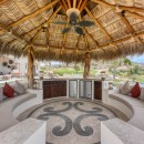 Seemingly blending seamlessly with its elevated surroundings, the villa boasts sweeping views of the ocean and beyond. At the heart of the private outdoor space, you'll find a resort-style infinity swimming pool, complete with a thatched palapa covering a swim-up bar and lounge area. Spend your afternoons and evenings here, basking in the scenery, surrounded by palm trees extending from the pool's "private island." This area also features a jacuzzi tub, six poolside deck loungers, and a nearby firepit with circular seating. White arches and columns frame the covered portion of the pool deck, which includes an outdoor living room, barbecue, and a dining table overlooking the ocean.