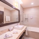Bedroom 3: Ground floor bedroom with a king-size bed (can be converted into two single beds), single roll away bed, single sofa bed, A/C, ceiling fan, WiFi, safe, sea view, terrace, and en-suite bathroom with bathtub, shower, vanity and WC. 2 guests maximum.