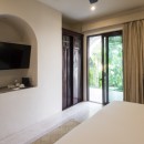 Bedroom 13 (Caracol): Bedroom with a king-size bed, A/C, TV, safe, terrace, and en-suite bathroom with shower, vanity, and WC. 2 guests maximum. First floor. Garden view.