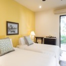 Bedroom 9 (Delfin): Bedroom with two single beds (that can be made up as a king upon request), A/C, TV, safe and en-suite bathroom with shower, vanity, and WC. 2 guests maximum. First floor. Garden view.