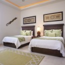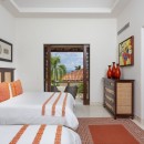 Bedroom 3: Bedroom with two queen-size beds, ceiling fan, A/C, TV, WiFi, garden view, access to the terrace, and en-suite bathroom with shower, vanity and WC. 2 guests maximum.