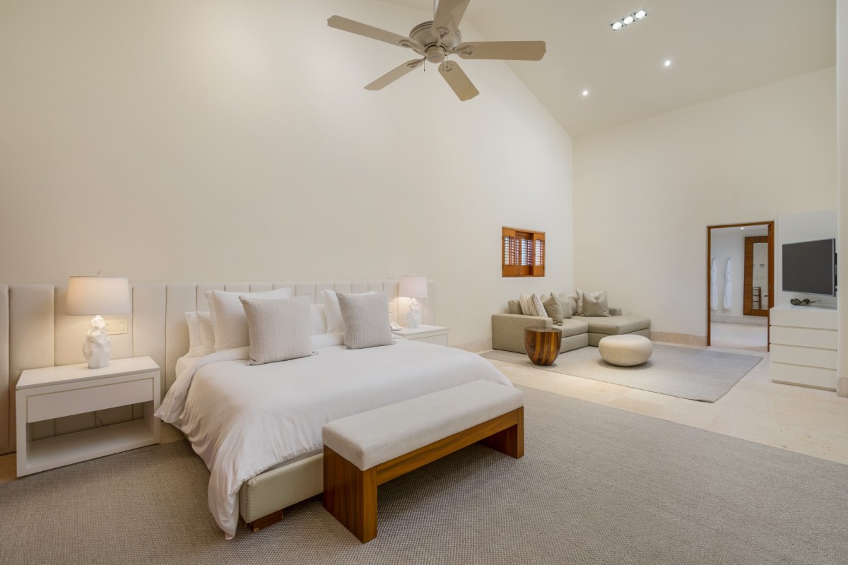 Bedroom 2: Master Bedroom with a king-size bed, ceiling fan, A/C, WiFi, TV, private terrace with pool, sea view, and en-suite bathroom with shower, double vanity and WC. 2 guests maximum.
