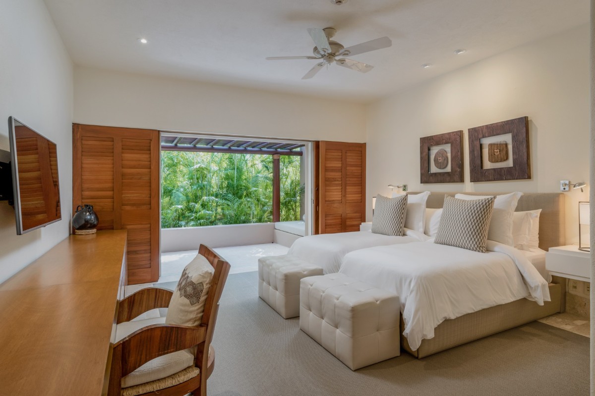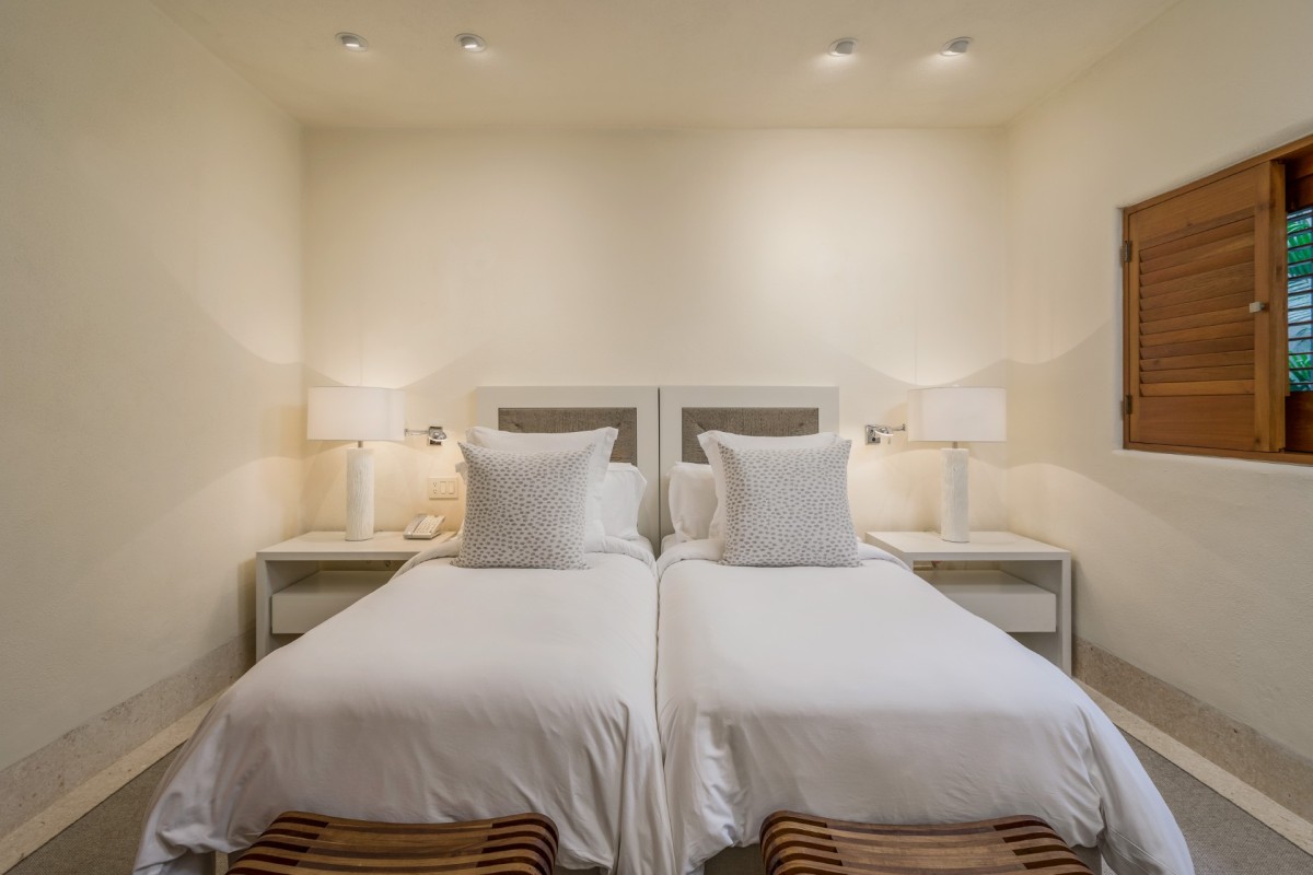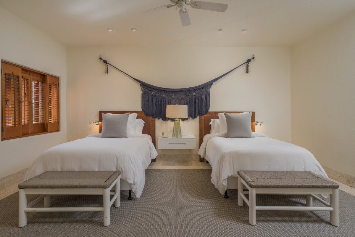 Bedroom 3: Bedroom with two single beds with trundles, ceiling fan, A/C, TV, WiFi, access to the terrace, and en-suite bathroom with shower, double vanity and WC. 2 guests maximum.