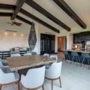The living space features ample, comfortable seating, a flat-screen television with satellite access, and gorgeous high ceilings with dark wood beams. Prepare gourmet meals in the chef’s kitchen, or arrange for one of our private chefs to cook for you and your family during your stay.