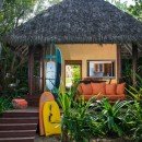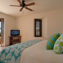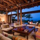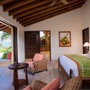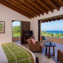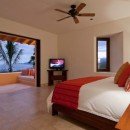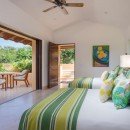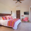 There are seven bedrooms and eight-and-a-half bathrooms. All bedrooms have a private terrace that faces the ocean. The master suite features 180-degree views from a wraparound terrace, indoor and outdoor showers, and a small office. There are two bedrooms with king-size beds, one bedroom with two queen-size beds, and a bunk room that can sleep up to six people. Two private casitas, one with a king-size bed and the other with two queens, are just steps from the beach. There is also a loft above the media room which can sleep four people on pullout futons.