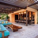 The back of the home features a large, private cabana that leads to the infinity-style pool and Jacuzzi. Lush, green grassy areas make the perfect place for children to run around and play. There is an outdoor bar nearby with plenty of comfortable seating. Families and friends can gather by the fire pit in the evenings to enjoy the night sky and sea breeze. Take the winding stairs down to the beach and relax in a private beach-side cabana.