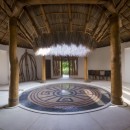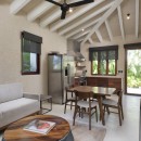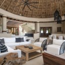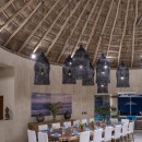 Inside the beautifully designed villa are many shared living spaces. These include a truly remarkable great room that sits beneath the cathedral height ceiling of the palapa-styled space. A round room with natural leaf roof, it has a colorfully decorated living room area, a full-sized dining room, and a set of steps leads into the gourmet kitchen. Designed for a chef, it is a fully-equipped kitchen with areas for casual dining.