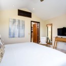 Bedroom 1: Ground floor bedroom with a king-size bed, ceiling fan, A/C, TV, WiFi, and en-suite bathroom with shower, vanity and WC. 2 guests maximum.