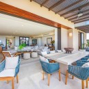 Step inside and discover the indoor and outdoor dining areas, perfect for enjoying meals with family and friends. The villa is fully air-conditioned, ensuring a comfortable stay. The living area features excessively comfortable large couches, inviting you to relax and unwind. Collapsible glass walls maximize the ocean and sunset views, creating a seamless connection with the outdoors. The well-equipped kitchen provides all the essentials for preparing delicious meals.
