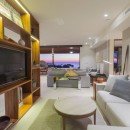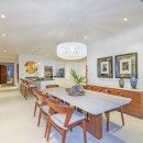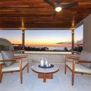 And though there are many great things to do outside of the villa, it too has an array of facilities and amenities that make it a great destination all on its own. For one, there is the enormous balcony that is home to an oversized, infinity-edge plunge pool, and a sun deck. The balcony is enormous and wraps around the side of the villa. It is large enough to accommodate the pool as well as a unique, rounded sunbed with retractable top. There are al fresco dining and lounging spaces, and the Midcentury Modern esthetic creates a wonderful mood indoors and out.