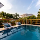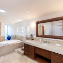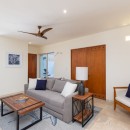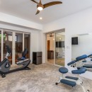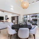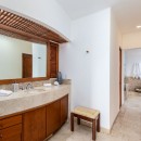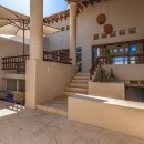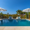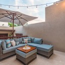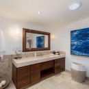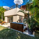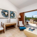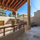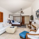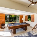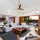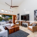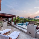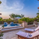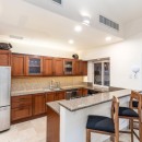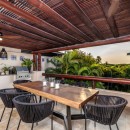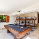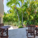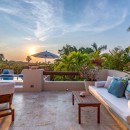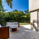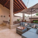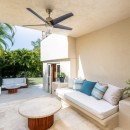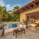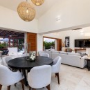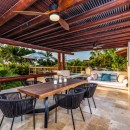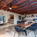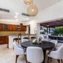 Professionally decorated, the villa features a main living area complete with a 75” smart TV and a dining table that seats eight, opening to front and back terraces for additional dining options. The fully equipped kitchen includes granite counters, stainless steel appliances, and a built-in cappuccino machine, providing everything needed to prepare gourmet meals. The adjacent terrace features an 8-person Parota wood dining table and a Viking grill. A half bath is located off the living room area.