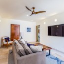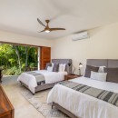 Bedroom 3: Ground floor bedroom with two queen beds, ceiling fan, A/C, TV, WiFi, walk-in closet, private terrace, and en-suite bathroom with shower, vanity and WC. 2 guests maximum.