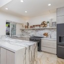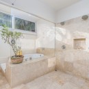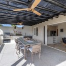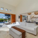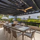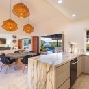 As you step through the doors of Casa Libre, you're instantly transported to paradise. The living area appears to float, offering breathtaking views of the azure sky, the shimmering pool, palm trees, and glimpses of the ocean. The adjacent outdoor space is equally enchanting, featuring a covered dining area for twelve—ideal for family gatherings or entertaining. It also includes a gas grill and a granite serving area with a convenient pass-through window to the kitchen.