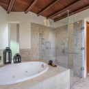 Bedroom 1: First floor Master bedroom with a king-size bed, sofa, ceiling fan, A/C, TV, WiFi, walk-in closet, terrace, and en-suite bathroom with bathub, indoor/outdoor shower, double vanity and WC. 2 guests maximum.