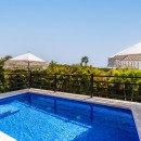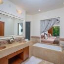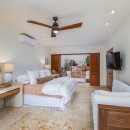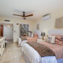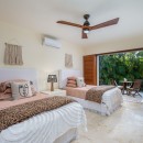 Bedroom 4: Ground floor bedroom with two double beds, ceiling fan, A/C, TV, WiFi, balcony, walk-in closet, and en-suite bathroom with bathtub, shower, vanity and WC. 2 guests maximum.