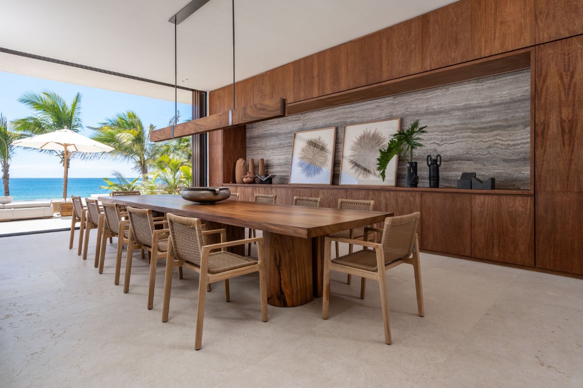 Inside, Casa Veneros is designed for both relaxation and entertaining. A cozy TV room and an expansive kitchen with bar seating for over six make it ideal for casual gatherings. For more formal occasions, the main dining room seats up to 12 guests in a warm setting highlighted by rich regional wood accents throughout the villa, creating a welcoming and sophisticated atmosphere.