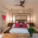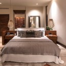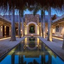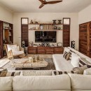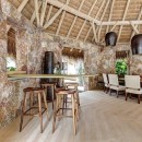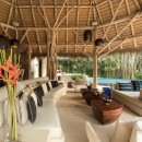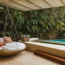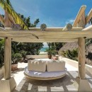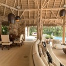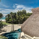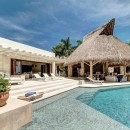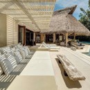 Seamlessly integrating indoor and outdoor spaces, the home's open-air layout features striking living areas where one can bask in the pool's refreshing waters or seek refuge under the sprawling grand palapa. A swinging daybed overlooking the tiered infinity pool invites relaxation as the sun gracefully dips below the horizon. Ornate collapsible doors effortlessly extend the indoor living and dining areas to the terraces, inviting in the gentle ocean breeze. Adding to the allure is the private rooftop terrace above the master suite, complete with a daybed offering breathtaking ocean views.
