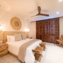 Bedroom 1: Master bedroom with a king-size bed, WiFi, A/C, ceiling fan, ocean view,  access to a shared terrace, and en-suite bathroom with bathtub, shower double vanity, and WC. 2 guests maximum.