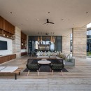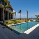 In the right wing, you’ll discover an entertainment room featuring a TV, pool table, and foosball table. Outside, the open-air dining and lounge area is perfect for al fresco meals, while the adjacent bar and grill area is ideal for BBQs and sunset cocktails. The highlight of the property is the expansive pool and sundeck area, where you can bask in the tropical sun on plush beach chairs and sunbeds. The left wing of the villa houses a fully equipped kitchen and a grand wooden dining room, illuminated by a modern, organically shaped light fixture. Here, you can savor meals prepared by the in-house chef and then relax in the indoor lounging area, where floor-to-ceiling windows offer stunning ocean views, creating a serene and immersive experience.
