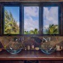 Upstairs at the villa are three master bedrooms to choose from. The first has a sitting room, a king bed, and a built-in sofa that can be used as an additional sleeping space. The sitting area has a large television that rotates into the sleeping area. A built-in desk sits under the spacious window with fantastic views of the Caribbean. The ensuite bathroom features a soaking tub and a rain shower. There is also a vanity with two sinks under a window facing the ocean.