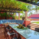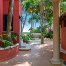 Tucked in amongst large and mature palms, this impressive villa features a stunning range of interior and exterior spaces to share or enjoy on your own. For many, the waterfront complex is impossible to ignore. There is a huge, beautifully tiled swimming pool framed by a lush lawn. It is steps from the decorative fountain that leads to the path to the beach. Nearby is the remarkably colorful gazebo where a circular banquette sofa serves as an unforgettable outdoor lounge. Nearby is an al fresco dining area large enough for the whole group. An outdoor kitchen makes it easy to prepare the meals while savoring the sea breezes and views.