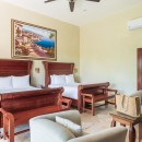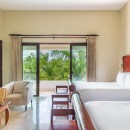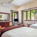 Bedroom 9: Second-floor bedroom with two queen-size beds, A/C, TV, ceiling fan, safe, hairdryer, balcony, garden view, and en-suite bathroom with shower, vanity, and WC. 2 guests maximum.