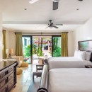 Bedroom 10: Ground-floor bedroom with two queen-size beds, A/C, TV, ceiling fan, safe, hairdryer, terrace, access to the pool area, garden view, and en-suite bathroom with shower, vanity, and WC. 2 guests maximum.