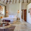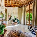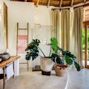 The three bedrooms are like works of art and include a master suite with a rounded outer wall that opens to a terrace. With a grass roof and beautiful furnishings, it is a spa-like retreat. It includes a large private bath. The other two suites are similar in tone and include queen beds and private terraces along with premium ensuite baths.