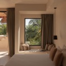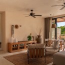 Chechén Penthouse forms part of Aldea Canzul, a private complex comprising three villas situated in Tulum's most prestigious beach road area. Crafted for utmost privacy and relaxation, this suite provides a tropical-inspired ambiance coupled with the comforts of a high-end accommodation. Immerse yourself in the lavish bathroom featuring double sinks, an open shower, and a stunning chukum bathtub handcrafted from the resin of a local tree.