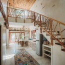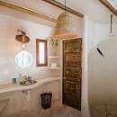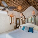 One bedroom is located on the main floor and comes with a queen bed for a couple or the kids. Reaching the other bedroom requires climbing the stairwell and crossing a bridge to reach a romantic master suite with a Juliette balcony, a vaulted palapa roof, and an ensuite bathroom with a shower. Both bedrooms have a tropical style with neutral colors and wood accents.