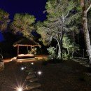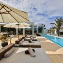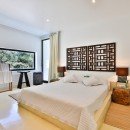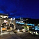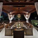 The heart of the villa is the main level pool terrace. Featuring a long and elegant stretch of a pool, it is framed by the stone terrace. Furnished with stylish and oversized lounges it lets you savor the beautiful lines of the villa itself. With a large and air outdoor lounge nearby, you’ll spend days and nights enjoying the scenery or starry skies. Nearby and tucked into a quiet corner is also your oversized sun bed, which is sized like a gazebo and perfect for days and nights outdoors.