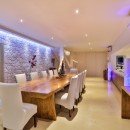 Just inside from the pool is the enormous great room with hits high white ceilings and pale palette to reflect the gorgeous light and scenery just outside. There is a casual and elegantly decorated lounge, a large and formal dining area, and just steps away is the enormous and well-appointed kitchen.
