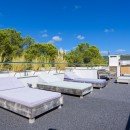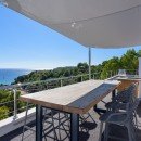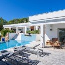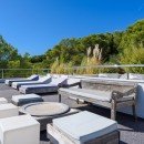 The expansive outdoor terrace presents a sanctuary of shaded seating and dining enclaves, accompanied by a fully-furnished summer kitchen designed for open-air culinary experiences. Another serene oasis awaits on a wooden platform nestled beneath the fragrant pine canopy—a shaded chill-out area where you can recline. For those seeking a higher perspective, the rooftop unveils an entirely new realm of sun-soaked entertainment spaces.