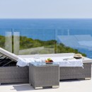 Villa La Costa features exceptional outdoor spaces meticulously designed to maximize the allure of its breathtaking sea views. The expansive terrace is perfect for hosting grand-scale gatherings, and the private infinity pool and hot tub offer idyllic sea views above the neighboring palm trees. Bask in the sunlight on a poolside lounger during the day, and as dusk falls, witness the sunset over the nearby pine forests from the comfort of plush sofa seating on the terrace. Alternatively, savor a delightful meal with friends under the starlit sky, sheltered by the contemporary pergola.