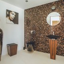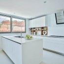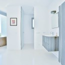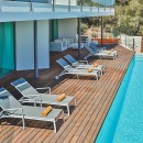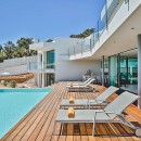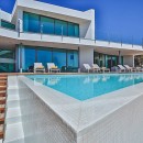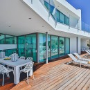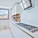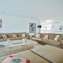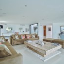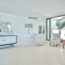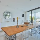 The interior exudes elegance with its polished white stone floors that span across the entire space. The capacious and luminous kitchen stands out, featuring a striking dining area that accommodates ten individuals in sophistication and comfort. This space seamlessly extends onto a sleek outdoor deck. The decor combines neutral, refined furnishings with contemporary elements, including distinctive artworks and decor pieces that enhance the ambiance.
