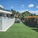 Stepping outdoors immerses you in the splendor of the surroundings. A refined hardwood deck spans the width of the property, providing both shaded and sunlit lounge areas. The extensive outdoor terraces beckon for leisurely moments, and the south-facing pool awaits, ready to be enjoyed to the fullest.