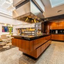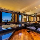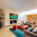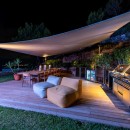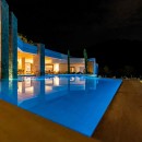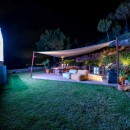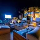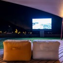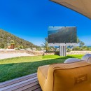 Outdoor entertainment is elevated with a retractable giant screen, ideal for outdoor movie nights or watching sporting events. The unique 144" CSEED Entertainment system rotates 180°, offering optimal viewing from various vantage points, including the outdoor sofas, pool, or even the Master ensuite's standalone bathtub.