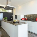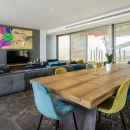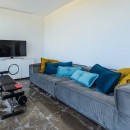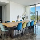The villa’s vast sliding glass doors seamlessly open the indoor living spaces to the outdoor terraces, blending modern minimalism with sophisticated living. In the main living area, a white formal dining table seats twelve, and an expansive white sofa arrangement overlooks the pool. At the far end of the room, a sleek kitchen, featuring glossy white surfaces and marble accents, is fully equipped for preparing meals for your entire group.