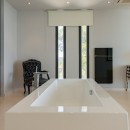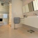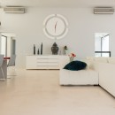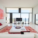 Vista Infinita's minimalist design language extends indoors, characterized by gleaming polished floors, a chic monochromatic color scheme, expansive white leather sofas, and walls adorned with glass, creating an open, luminous living space that is both inviting and functional. A spacious dining area and a sleek, fully equipped kitchen complete the picture.