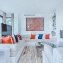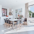 The interiors of the villa are bathed in natural light, seamlessly blending contemporary elegance with modern amenities. Each room exudes a sense of spaciousness and warmth, adorned with tasteful furnishings in neutral shades, harmoniously accentuated by contemporary details. A luminous breakfast room and a sleek, modern kitchen further enhance the living space.