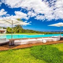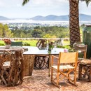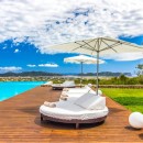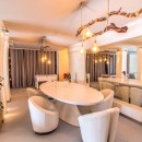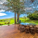 Two al-fresco dining areas grace a terrace overlooking the pool, providing an ideal setting for meals in the open air. This sun-kissed terrace seamlessly connects with the main interior living spaces.