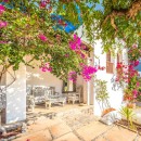 The charming holiday home boasts low-slung whitewashed walls adorned with whimsical Gaudi-inspired curves, effortlessly merging with sleek wooden decking terraces. Within the expansive garden, numerous idyllic spots invite you to bask in the glorious Ibizan sunshine. Take respite in the shade of a terrace enveloped by vibrant pink bougainvillea, savor a delightful meal with friends beneath a canopied oasis, or indulge in pure bliss lounging on a poolside daybed.
